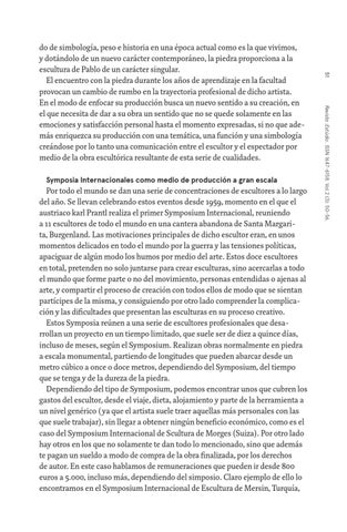 do de simbología, peso e historia en una época actual como es la que vivimos, y dotándolo de un nuevo carácter contemporáneo, la piedra proporciona a la escultura de Pablo de un carácter singular. El encuentro con la piedra durante los años de aprendizaje en la facultad provocan un cambio de rumbo en la trayectoria profesional de dicho artista. En el modo de enfocar su producción busca un nuevo sentido a su creación, en el que necesita de dar a su obra un sentido que no se quede solamente en las emociones y satisfacción personal hasta el momento expresadas, si no que además enriquezca su producción con una temática, una función y una simbología creándose por lo tanto una comunicación entre el escultor y el espectador por medio de la obra escultórica resultante de esta serie de cualidades.