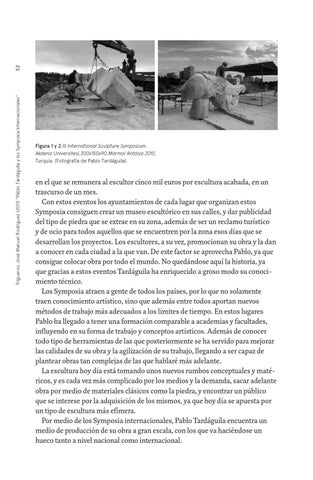 en el que se remunera al escultor cinco mil euros por escultura acabada, en un trascurso de un mes. Con estos eventos los ayuntamientos de cada lugar que organizan estos Symposia consiguen crear un museo escultórico en sus calles, y dar publicidad del tipo de piedra que se extrae en su zona, además de ser un reclamo turístico y de ocio para todos aquellos que se encuentren por la zona esos días que se desarrollan los proyectos. Los escultores, a su vez, promocionan su obra y la dan a conocer en cada ciudad a la que van. De este factor se aprovecha Pablo, ya que consigue colocar obra por todo el mundo. No quedándose aquí la historia, ya que gracias a estos eventos Tardáguila ha enriquecido a groso modo su conocimiento técnico. Los Symposia atraen a gente de todos los países, por lo que no solamente traen conocimiento artístico, sino que además entre todos aportan nuevos métodos de trabajo más adecuados a los límites de tiempo. En estos lugares Pablo ha llegado a tener una formación comparable a academias y facultades, influyendo en su forma de trabajo y conceptos artísticos. Además de conocer todo tipo de herramientas de las que posteriormente se ha servido para mejorar las calidades de su obra y la agilización de su trabajo, llegando a ser capaz de plantear obras tan complejas de las que hablaré más adelante. La escultura hoy día está tomando unos nuevos rumbos conceptuales y matéricos, y es cada vez más complicado por los medios y la demanda, sacar adelante obra por medio de materiales clásicos como la piedra, y encontrar un público que se interese por la adquisición de los mismos, ya que hoy día se apuesta por un tipo de escultura más efímera. Por medio de los Symposia internacionales, Pablo Tardáguila encuentra un medio de producción de su obra a gran escala, con los que va haciéndose un hueco tanto a nivel nacional como internacional.