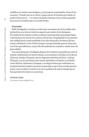 Pablo Tardáguila es un joven escultor que encuentra una de las salidas más productivas a su obra en todos los aspectos por medio de los Symposia. Por medio de los mismos realiza esculturas monumentales que pueden llegar a dimensiones de más de tres metros a día de hoy. Desplegando en las mismas una calidad técnica nada envidiable a los más destacados escultores del momento, añadiendo a esto el factor tiempo, siempre limitado para las dimensiones de las que hablamos, no por ello descuidando los acabados, siendo éstos de gran calidad. Con estos Symposia, Tardáguila dispone de esculturas repartidas por todo el mundo conformando un museo urbano, con esculturas colocadas en La Bresse (Fráncia), Antalya (Turquía), dos en Argentina (América del Sur), o Alanya (Turquía), por no mencionar otras tantas repartidas en España, en ciudades como Almería, Salamanca, Zaragoza, y un largo etcétera que conforman un conjunto bastante amplio a pesar de su juventud, y que le han servido para formarse como escultor, y conocer a la vez a escultores de todo el mundo que le han aportado otro tanto en su persona. Contactar o autor: jmrodriguez.trigueros@gmail.com