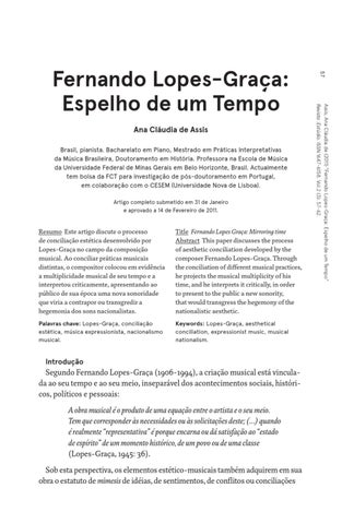 Title Fernando Lopes Graça: Mirroring time Abstract This paper discusses the process of aesthetic conciliation developed by the composer Fernando Lopes-Graça. Through the conciliation of different musical practices, he projects the musical multiplicity of his time, and he interprets it critically, in order to present to the public a new sonority, that would transgress the hegemony of the nationalistic aesthetic.