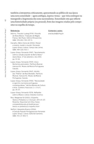 Carvalho, Mário Vieira de (2006). Pensar a música, mudar o mundo: Fernando Lopes-Graça. Lisboa: Campo das Letras. ISBN: 989-625-103-7. Lopes-Graça, Fernando (1947). “Apontamento sobre a canção popular da Beira-Baixa.” Seara Nova. 27 de setembro. Ano XXVI, pp. 51-54. Lopes-Graça, Fernando (1959). Cinco Nocturnos para piano. Partitura Musical, manuscrito. Museu da Música Portuguesa, Cascais. Lopes-Graça, Fernando (1967). Intróito aos “Pobres” de Raul Brandão. Partitura Musical, manuscrito. Museu da Música Portuguesa, Cascais. Lopes-Graça, Fernando (1945). “Necessidade e capricho na música portuguesa contemporânea.” Vértice Revista de Cultura e Arte. Coimbra: Fasciculo 2, n. 8 a 11, pp. 35-37. Lopes-Graça, Fernando (1978). Reflexões sobre a Música. Lisboa: Edições Cosmos. Reis, Margarida Gil (2003). O Espelho, Textos e Pretextos n.2. [Consult. 2011‑01‑27] Resenha. Disponível em http://www. comparatistas.edu.pt/publicacoes/ textos-e-pretextos/o-espelho.html Weffort, Alexandre Branco (2006). A Canção Popular Portuguesa em Fernando Lopes-Graça. Lisboa: Editorial Caminho. ISBN: 972-21-1812-9.