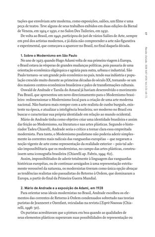 No ano de 1927, quando Hugo Adami volta de sua primeira viagem à Europa, o Brasil estava às vésperas de grandes mudanças políticas, pois passaria de uma orientação econômica oligárquica e agrária para outra, urbana e industrial. São Paulo tornava-se um grande polo econômico no país, tendo sua indústria e população crescido muito durante as primeiras décadas do século XX, tornando-se um dos maiores centros econômicos brasileiros e palco de transformações culturais. Oswald de Andrade e Tarsila do Amaral já haviam desenvolvido o movimento Pau Brasil, que apresentou um novo direcionamento para o Modernismo brasileiro: redimensionar o Modernismo local para a criação de uma arte moderna nacional. Não bastava mais romper com a arte realista de cunho burguês, existente na época, e atualizar a inteligência brasileira; ser moderno no Brasil era buscar e caracterizar sua própria identidade em relação ao mundo ocidental. Mário de Andrade tinha como objetivo criar uma identidade brasileira e assim dar feição ao Modernismo, na literatura e nas artes plásticas. Segundo o historiador Tadeu Chiarelli, Andrade seria o crítico a tornar clara essa empreitada modernista. Para tanto, o Modernismo paulistano não poderia aderir simplesmente às correntes mais radicais das vanguardas européias – que negavam a noção vigente de arte como representação da realidade exterior – pois tal adesão impossibilitaria que os modernistas, no campo das artes plásticas, construíssem uma iconografia brasileira (Chiarelli ap. Fabris, 1994: 62). Assim, impossibilitados de aderir totalmente à linguagem das vanguardas históricas européias, ou de continuar arraigados à uma representação estritamente verossível da natureza, os modernistas tiveram como única opção abraçar as tendências realistas não passadistas do Retorno à Ordem, que dominaram a Europa, a partir do final da Primeira Guerra Mundial. 2. Mário de Andrade e a exposição de Adami, em 1928