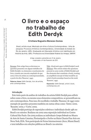 O livro e o espaço no trabalho de Edith Derdyk Cristiana Nogueira Menezes Gomes Brasil, artista visual. Mestrado em Arte e Cultura Contemporânea - linha de pesquisa: Processos Artísticos Contemporâneos, Universidade do Estado do Rio de Janeiro, UERJ. Graduação em Educação Artística com habilitação em História da Arte, UERJ. Professora na Universidade Federal do Amapá, UNIFAP. Artigo completo submetido em 31 de Janeiro e aprovado a 14 de Fevereiro de 2011.