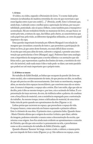 O códice, ou códex, segundo o Dicionário do Livro, “é o nome dado pelos romanos às tabuinhas de madeira revestidas de cera em que escreviam e que eram ligadas entre si por um cordel […]” (Pericão, 2008). Este é o formato que, ainda hoje, é adotado como o melhor para a apreciação da leitura, por sua portabilidade, praticidade, não só para o folheio, como também para o transporte e acomodação. Há um verdadeiro fetiche no manusear do livro, em que busca-se sentir pelo tato, a textura da capa, das folhas; pelo cheiro, as características que cada papel traz; pela visão, as diferentes tipografias utilizadas, as cores do papel impresso e da capa. Uma questão importante levantada por Alberto Manguel é em relação às margens que circundam a mancha de texto e, que permitem a participação do leitor no livro, já que antes deste formato, era mais difícil disso ocorrer. A escrita que está para além do texto, subverte o original, e permite uma intervenção que particulariza o livro (Manguel, 1997). Podemos fazer uma analogia com a importância da margem para a escrita islâmica e as anotações que são feitas nela e, que representam a quebra dos limites do texto, o território do visível e do invisível, onde nada mais é dito e tudo pode-se dizer, um texto paralelo que poderá ser até mais importante que o próprio texto.