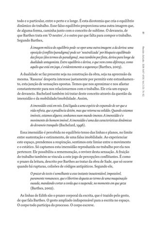 A dualidade se faz presente seja na construção da obra, seja na apreensão da mesma. 'Rasuras' desperta interesse justamente por permitir este estranhamento, esta junção de sensações opostas. Temos que nos aproximar e nos afastar constantemente para nos relacionarmos com o trabalho. Ele cria um espaço de devaneio. Bachelard também irá tratar deste conceito através da questão da imensidão e da mobilidade/imobilidade. Assim, A imensidão está em nós. Está ligada a uma espécie de expansão de ser que a vida refreia, que a prudência detém, mas que retorna na solidão. Quando estamos imóveis, estamos algures; sonhamos num mundo imenso. A imensidão é o movimento do homem imóvel. A imensidão é uma das características dinâmicas do devaneio tranquilo (Bachelard, 1996). Essa imensidão é percebida no equilíbrio tenso das linhas e planos, no limite entre sustentação e estiramento, de uma falsa imobilidade. Ao experienciar este espaço, prendemos a respiração, sentimos este limiar entre o movimento e o estático. Só captamos esta imensidão reproduzida no trabalho por ela nos pertencer. Ele possibilita a rememoração, o reviver desta sensação. A fruição do trabalho também se vincula a este jogo de percepções conflitantes. É como o prazer da leitura, descrito por Barthes ao tratar da obra de Sade, que só ocorre quando há rupturas, colisões de códigos antipáticos. Segundo ele, O prazer do texto é semelhante a esse instante insustentável, impossível, puramente romanesco, que o libertino degusta ao termo de uma maquinação ousada, mandando cortar a corda que o suspende, no momento em que goza (Barthes, 2002). As linhas de Edith são o prazer corporal da escrita, que é trazido pelo gesto, de que fala Barthes. O gesto ampliado indispensável para a escrita no espaço. O corpo todo participa do processo. O corpo escreve.
