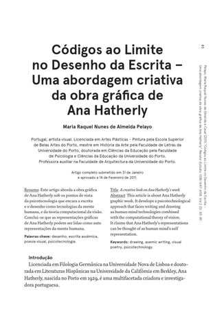 Title A creative look on Ana Hatherly’s work Abstract This article is about Ana Hatherly graphic work. It develops a psicotechnological approach that faces writing and drawing as human mind technologies combined with the computational theory of vision. It claims that Ana Hatherly’s representations can be thought of as human mind’s self representation. Keywords: drawing, asemic writing, visual poetry, psicotechnology.