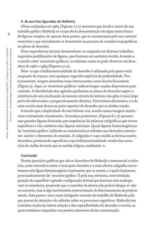 Nestas aparições gráficas que são os desenhos de Hatherly e transversal a todos eles, neste interstício entre o mais puro desenho e a mais aberta caligrafia encontramos esta figura fantasmagórica insinuante que os anima, e à qual chamamos, provocadoramente de ‘neurónio gráfico.’ É pela sua estrutura, conectividade, geração de superfície e grande configuração formal que fazemos esta analogia com os neurónios, propondo que o caminho da abstracção poderá chegar ai: não ao concreto, mas à algo involuntária representação do funcionamento da própria mente. Esta parece-nos a mais intrigante vertente do trabalho de Hatherly pelo que possui de intuição e de reflexão sobre os processos cognitivos. Hatherly tem cristalina noção da íntima relação e das especificidades do desenho e escrita, as quais tentámos enquadrar nos pontos anteriores desta comunicação.