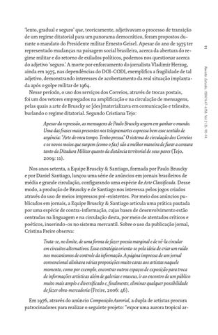 ‘lento, gradual e seguro’ que, teoricamente, adjetivavam o processo de transição de um regime ditatorial para um panorama democrático, foram propostos durante o mandato do Presidente militar Ernesto Geisel. Apesar do ano de 1975 ter representado mudanças na paisagem social brasileira, acerca da abertura do regime militar e do retorno de exilados políticos, podemos nos questionar acerca do adjetivo ‘seguro.’ A morte por enforcamento do jornalista Vladimir Herzog, ainda em 1975, nas dependências do DOI-CODI, exemplifica a fragilidade de tal adjetivo, demonstrando interesses de acobertamento da real situação implantada após o golpe militar de 1964. Nesse período, o uso dos serviços dos Correios, através de trocas postais, foi um dos vetores empregados na amplificação e na circulação de mensagens, pelas quais a arte de Bruscky se [des]materializava em comunicação e trânsito, burlando o regime ditatorial. Segundo Cristiana Tejo: