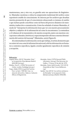 Muntadas, Antoni (1979) Personal/Public Information, [cat.exp.] The Vancouver Art Gallery, 17-marzo-16 de abril de 1979. Muntadas, Antoni (sd) [Consulta 13-01-2013] Disponible en http://www.thefileroom. org/ Spieker, Sven (2012) “Los archivos entrópicos de Muntadas” en la exposición Entre. Between [cat.exp.] Madrid: MNCARS.