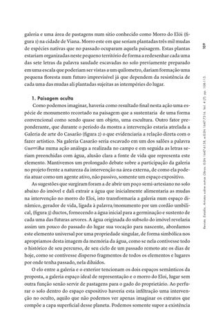 galeria e uma área de pastagens num sitio conhecido como Morro do Elói (figura 1) na cidade de Viana. Morro este em que seriam plantadas três mil mudas de espécies nativas que no passado ocuparam aquela paisagem. Estas plantas estariam organizadas neste pequeno território de forma a redesenhar cada uma das sete letras da palavra saudade escavadas no solo previamente preparado em uma escala que poderiam ser vistas a um quilometro, dariam formação uma pequena floresta num futuro imprevisível já que dependem da resistência de cada uma das mudas ali plantadas sujeitas as intempéries do lugar.