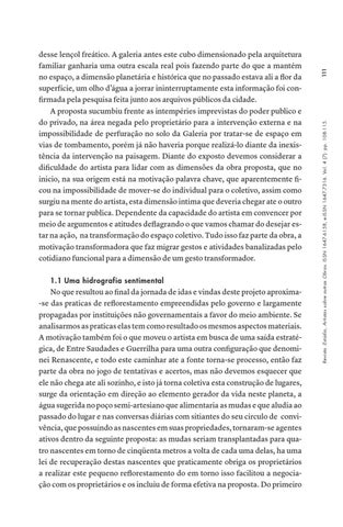 desse lençol freático. A galeria antes este cubo dimensionado pela arquitetura familiar ganharia uma outra escala real pois fazendo parte do que a mantém no espaço, a dimensão planetária e histórica que no passado estava ali a flor da superfície, um olho d’água a jorrar ininterruptamente esta informação foi confirmada pela pesquisa feita junto aos arquivos públicos da cidade. A proposta sucumbiu frente as intempéries imprevistas do poder publico e do privado, na área negada pelo proprietário para a intervenção externa e na impossibilidade de perfuração no solo da Galeria por tratar-se de espaço em vias de tombamento, porém já não haveria porque realizá-lo diante da inexistência da intervenção na paisagem. Diante do exposto devemos considerar a dificuldade do artista para lidar com as dimensões da obra proposta, que no inicio, na sua origem está na motivação palavra chave, que aparentemente ficou na impossibilidade de mover-se do individual para o coletivo, assim como surgiu na mente do artista, esta dimensão intima que deveria chegar ate o outro para se tornar publica. Dependente da capacidade do artista em convencer por meio de argumentos e atitudes deflagrando o que vamos chamar do desejar estar na ação, na transformação do espaço coletivo. Tudo isso faz parte da obra, a motivação transformadora que faz migrar gestos e atividades banalizadas pelo cotidiano funcional para a dimensão de um gesto transformador.
