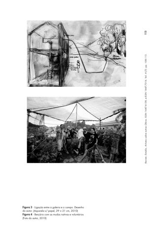 Figura 3 ∙ Ligação entre a galeria e o campo. Desenho do autor. (Aquarela s/ papel, 29 × 21 cm, 2010) Figura 4 ∙ Berçário com as mudas nativas e voluntários (Foto do autor, 2010)