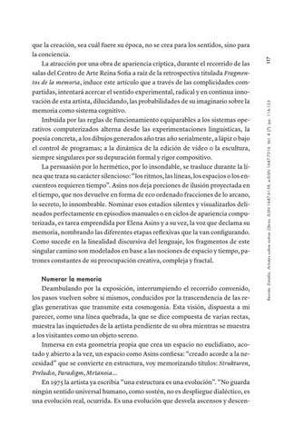 que la creación, sea cuál fuere su época, no se crea para los sentidos, sino para la conciencia. La atracción por una obra de apariencia críptica, durante el recorrido de las salas del Centro de Arte Reina Sofia a raíz de la retrospectiva titulada Fragmentos de la memoria, induce este artículo que a través de las complicidades compartidas, intentará acercar el sentido experimental, radical y en continua innovación de esta artista, dilucidando, las probabilidades de su imaginario sobre la memoria como sistema cognitivo. Imbuida por las reglas de funcionamiento equiparables a los sistemas operativos computerizados alterna desde las experimentaciones linguísticas, la poesía concreta, a los dibujos generados año tras año serialmente, a lápiz o bajo el control de programas; a la dinámica de la edición de vídeo o la escultura, siempre singulares por su depuración formal y rigor compositivo. La persuasión por lo hermético, por lo insondable, se trasluce durante la línea que traza su carácter silencioso: “los ritmos, las líneas, los espacios o los encuentros requieren tiempo”. Asins nos deja porciones de ilusión proyectada en el tiempo, que nos devuelve en forma de eco ordenado fracciones de lo arcano, lo secreto, lo innombrable. Nominar esos estadios silentes y visualizarlos delineados perfectamente en episodios manuales o en ciclos de apariencia computerizada, es tarea emprendida por Elena Asins y a su vez, la voz que declama su memoria, nombrando las diferentes etapas reflexivas que la van configurando. Como sucede en la linealidad discursiva del lenguaje, los fragmentos de este singular camino son modelados en base a las nociones de espacio y tiempo, patrones constantes de su preocupación creativa, compleja y fractal.