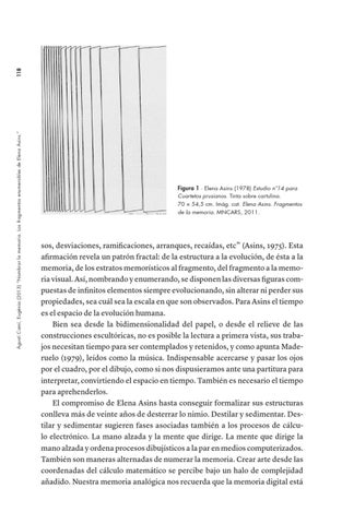 sos, desviaciones, ramificaciones, arranques, recaídas, etc” (Asins, 1975). Esta afirmación revela un patrón fractal: de la estructura a la evolución, de ésta a la memoria, de los estratos memorísticos al fragmento, del fragmento a la memoria visual. Así, nombrando y enumerando, se disponen las diversas figuras compuestas de infinitos elementos siempre evolucionando, sin alterar ni perder sus propiedades, sea cuál sea la escala en que son observados. Para Asins el tiempo es el espacio de la evolución humana. Bien sea desde la bidimensionalidad del papel, o desde el relieve de las construcciones escultóricas, no es posible la lectura a primera vista, sus trabajos necesitan tiempo para ser contemplados y retenidos, y como apunta Maderuelo (1979), leídos como la música. Indispensable acercarse y pasar los ojos por el cuadro, por el dibujo, como si nos dispusieramos ante una partitura para interpretar, convirtiendo el espacio en tiempo. También es necesario el tiempo para aprehenderlos. El compromiso de Elena Asins hasta conseguir formalizar sus estructuras conlleva más de veinte años de desterrar lo nimio. Destilar y sedimentar. Destilar y sedimentar sugieren fases asociadas también a los procesos de cálculo electrónico. La mano alzada y la mente que dirige. La mente que dirige la mano alzada y ordena procesos dibujísticos a la par en medios computerizados. También son maneras alternadas de numerar la memoria. Crear arte desde las coordenadas del cálculo matemático se percibe bajo un halo de complejidad añadido. Nuestra memoria analógica nos recuerda que la memoria digital está