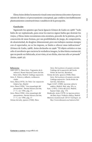 Asins: De la pintura a la poesía concreta. Catálogo de la exposición del Cercle Artístic de Sant Lluc, Barcelona. Gómez de Liaño, Ignacio (1968). Elena Asins: De la pintura a la poesía concreta. Catálogo exposición. Cercle Artístic de Sant Lluc, Barcelona. Hegel, G.W.F. (1989). Lecciones sobre la estética. Madrid, Akal. pág. 28 y ss. Kant, I (1991). Crítica del juicio. Madrid, Espasa Calpe. pág. 173. Maderuelo, Javier (1979). La rigurosa pintura de Elena Asins. Profesión médica, Madrid. Memoria visual [Consult. 2013113] Dispon. en http://www.elenaasins.es/memoria.html