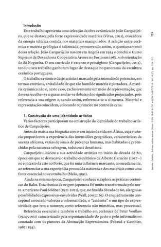 Este trabalho apresenta uma selecção da obra cerâmica de João Carqueijeiro, que se destaca pela forte expressividade matérica (Vivas, 2011), evocadora da energia telúrica contida nos materiais manipulados. A relação entre cerâmica e matéria geológica é salientada, promovendo assim, o questionamento dessa relação. João Carqueijeiro nasceu em Angola em 1954 e conclui o Curso Superior de Desenho na Cooperativa Árvore no Porto em 1982, sob orientação de Sá Nogueira. O seu currículo é extenso e prestigioso (Carqueijeiro, 2013), tendo o seu trabalho ganho um lugar de destaque no panorama da escultura cerâmica portuguesa. O trabalho cerâmico deste artista é marcado pela intensão de potenciar, em termos estéticos, a vitalidade de que tão humilde matéria é portadora, A matéria cerâmica não é, neste caso, exclusivamente um meio de representação, que deverá recolher-se e quase anular-se debaixo dos significados projectados, pois referencia a sua origem e, sendo assim, referencia-se a si mesma. Material e representação coincidem, colocando o primeiro no centro da cena.