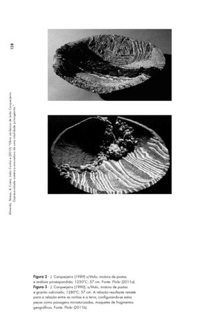 Figura 2 ∙ J. Carqueijeiro (1989) s/título; mistura de pastas e ardósia piroexpandida; 1250°C; 57 cm. Fonte: Flickr (2011a). Figura 3 ∙ J. Carqueijeiro (1990), s/título, mistura de pastas e granito calcinado; 1280ºC; 57 cm. A relação resultante remete para a relação entre as rochas e a terra, configurando-se estas peças como paisagens miniaturizadas, maquetes de fragmentos geográficos. Fonte: Flickr (2011b).