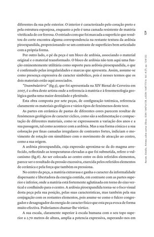 diferentes da sua pele exterior. O interior é caracterizado pelo coração preto e pela estrutura esponjosa, enquanto a pele é uma camada resistente de matéria vitrificada de cor ferrosa. O estriado com que foi marcada a superficie que resultou do corte encontra alguma correspondencia na restante textura da ardósia piroexpandida, proporcionando-se um contraste de superfícies bem articulado com a própria forma. Por outro lado, o pé da peça é um bloco de ardósia, associando o material original e o material transformado. O bloco de ardósia não tem aqui uma função eminentemente utilitária como suporte para ardósia piroexpandida, o que é confirmado pelas irregularidades e marcas que apresenta. Assim, assume-se como presença expressiva de caracter simbólico, pois é nesses termos que os dois materiais estão aqui associados. “Deambulatório” (fig.5), que foi apresentada na XIV Bienal de Cerveira em 2007, é a obra deste artista onde a referencia à matéria e à fenomenologia geológica ganha uma maior densidade e plenitude. Esta obra composta por sete peças, de configuração totémica, referencia claramente os materiais geológicos e vários tipos de fenómenos deste teor. As partes em cerâmica de pastas de diferentes cores parecem resultar de fenómenos geológicos de caracter ciclíco, como são a sedimentação e compactação de diferentes materiais, como se expressassem a variação dos anos e a sua passagem, tal como acontece com a ardósia. Mas a sua forma cónica e a sua coloração por finas camadas irregulares de contrastes fortes, indiciam o movimento de rotação em simultâneo com o movimento de atracção ao centro, como a sua origem. A ardósia piroexpandida, cuja expressão aproxima-se da do magma arrefecido, reflectindo as temperaturas elevadas a que foi submetida, refere o vulcanismo (fig.6). Ao ser colocada ao centro entre os dois referidos elementos, parece ser o resultado da pressão excessiva, exercida pelos referidos elementos de cerâmica e pela força que também os pressiona. No centro da peça, a matéria extravasa e ganha o caracter da informalidade dispersante e libertadora da energia contida, em contraste com as partes superior e inferior, onde a matéria está fortemente aglutinada em torno do eixo vertical e confluindo para o centro. A ardósia piroexpandida torna-se o foco visual desta peça pela sua posição, pelas suas características, mas também pela sua conjugação com os restantes elementos, pois asume-se como o fulcro congregador e desagragador da energia de caracter físico que esta peça evoca de forma muito efectiva. Poderiamos chamar-lhe vórtice. A sua escala, claramente superior à escala humana com o seu topo superior a 2.70 metros de altura, amplia a potencia expressiva, superando-nos em