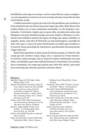 imobilidade a arte erige-se no tempo e contra o tempo (Steiner, 1992) e configura-se como equivalente ao universo, tal como os antigos talismãs, numa ideia de obra total (Calvino, 2009). Combina memórias e gestos de acções da vida quotidiana, que acentuam a força metafórica das suas obras como uma viagem que olha o lado obscuro das cidades dando a ver as suas construções inacabadas, os seus despojos e acumulações. Construções simples para as quais olha, reconhecendo nelas uma linhagem e um gesto fundador porque, por mais simples e efémeras, se constituem como unidades mínimas de espaço, de abrigo, que aliam o trabalho e o engenho. Assim, cada obra de PCR pode ser uma homenagem e a partilha de uma visão, que é a marca do autor transformada em dádiva que reconhece e se inscreve numa genealogia de construtores, questionando incessantemente o lugar onde está. Desta forma aproxima-se duma noção de clássico porque, no ritmo de vida actual que não reconhece tempos longos, nem a respiração do Otium humanista (Calvino, 2009) consegue criar ao ritmo do respirar combinando, nas suas obras, a actualidade, quer como ruído de fundo quer construindo, com as ruínas dessa actualidade, um tempo que persiste para além dele (durée), arriscando uma construção que sintetiza o passado e inventa o futuro.