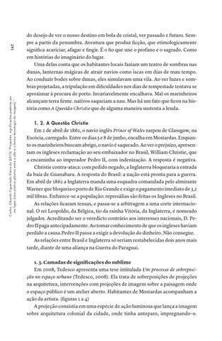 Em 2 de abril de 1861, o navio inglês Prince of Wales zarpou de Glassgow, na Escócia, carregado. Entre os dias 5 e 8 de junho, encalha em Mostardas. Enquanto os marinheiros buscam abrigo, o navio é saqueado. Ao ver o prejuízo, apresentam os ingleses reclamação ao seu embaixador no Brasil, William Christie, que a encaminha ao imperador Pedro II, com indenização. A resposta é negativa. Christie contra-ataca: com pedido negado, a Inglaterra bloquearia a entrada da baía de Guanabara. A resposta do Brasil: a nação está pronta para a guerra. Em abril de 1862 a Inglaterra manda uma esquadra comandada pelo almirante Warner que bloqueia o porto de Rio Grande e exige o pagamento imediato de 3,2 mil libras. Enfurece-se a população: represálias são feitas os Ingleses no Brasil. As relações ficaram tensas, e passa-se a arbitragem a uma corte internacional. O rei Leopoldo, da Bélgica, tio da rainha Vitória, da Inglaterra, é nomeado julgador. Acreditando ser o veredicto contrário aos interesses nacionais, D. Pedro II paga antecipadamente. Ao tomar conhecimento de que os ingleses haviam perdido a causa.Pedro II passa a exigir a devolução do dinheiro. Não consegue. As relações entre Brasil e Inglaterra só seriam restabelecidas dois anos mais tarde, diante de uma aliança na Guerra do Paraguai. 1. 3. Camadas de significações do sublime Em 2008, Tedesco apresenta uma tese intitulada Um processo de sobreposição no espaço urbano (Tedesco, 2008). Ela trata de sobreposições de projeções na arquitetura, intervenções com projeções de imagem sobre a paisagem onde o espaço público é um atelier aberto. Habitantes de Mostardas acompanham a ação da artista. (figuras 1 a 4) A projeção consistia em uma espécie de ação luminosa que lança a imagem sobre arquitetura colonial da cidade, onde tinha anteparo, impregnando-o.