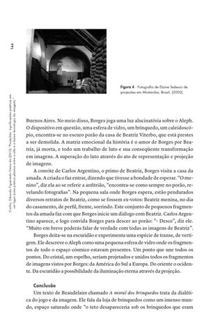 Buenos Aires. No meio disso, Borges joga uma luz alucinatória sobre o Aleph. O dispositivo em questão, uma esfera de vidro, um brinquedo, um caleidoscópio, encontra-se no escuro porão da casa de Beatriz Viterbo, que está prestes a ser demolida. A matriz emocional da história é o amor de Borges por Beatriz, já morta, e todo um trabalho de luto e sua conseqüente transformação em imagens. A superação do luto através do ato de representação e projeção de imagens. A convite de Carlos Argentino, o primo de Beatriz, Borges visita a casa da amada. A criada o faz entrar, dizendo que tivesse a bondade de esperar. “O menino”, diz ela ao se referir a anfitrião, “encontra-se como sempre no porão, revelando fotografias”. Na pequena sala onde Borges espera, estão pendurados diversos retratos de Beatriz, como se fossem ex-votos: Beatriz menina, no dia do casamento, de perfil, frente, sorrindo. Este conjunto de pequenos fragmentos da amada faz com que Borges inicie um diálogo com Beatriz. Carlos Argentino aparece, e logo convida Borges para descer ao porão: “- Desce”, diz ele. “Muito em breve poderás falar de verdade com todas as imagens de Beatriz”. Borges deita-se na escuridão e experimenta uma espécie de transe, de vertigem. Ele descreve o Aleph como uma pequena esfera de vidro onde os fragmentos de todo o espaço cósmico estavam presentes. Um ponto que une todos os pontos. Do cristal, um espelho, seriam projetados e unidos todos os fragmentos de imagens vistos por Borges: da América do Sul a Europa. Do oriente o ocidente. Da escuridão a possibilidade da iluminação eterna através da projeção. Conclusão