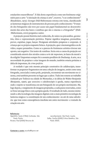 estalactites maravilhosas”. E fala desta experiência como um fenômeno originário para a arte: “a iniciação da criança à arte”, escreve, “e ao conhecimento” (Baudelaire, 1975). Georges Didi-Hubermann retoma este tema, classificando as lanternas mágicas de instrumentos de procura pelo conhecimento: “O mundo dos brinquedos não teve por acaso um papel fundamental no desenvolvimento das artes das luzes e sombras que são o cinema e a fotografia?” (Didi-Hubermann, 2002) pergunta o autor. A projeção possui história mal conhecida, de raízes na psicanálise, geometria, ótica e representação pictórica. Pojetar significa imaginar, premeditar, prever, expulsar, jogar, lançar. Designam atividades psíquicas e corporais. A criança que se projeta enquanto brinca. A projeção, quer cinematográfica ou de vídeo, requer penumbra. Como se a pureza do fenômeno artístico tivesse um oposto, um negativo. Um teatro de sombras. Seria esta a causa da projeção ser considerada através dos séculos como a arte da impostura, às luzes da moral e da religião? Impostura sempre foi o assunto predileto de Duchamp. A arte, ou a necessidade de projetar e criar imagem do mundo, também estaria próxima a idéia de impostura, de crime perfeito. A verdade é que este mesmo princípio construtivo do calidoscópio, transformar os pequenos fragmentos em uma coleção de imagens, assim como uma fotografia, associada à outra pode, projetada, reconstruir um movimento no cinema, está também presente no lugar que a adere. Tudo isto remete ao trabalho realizado por Tedesco na cidade de Mostardas, e às idéias de Walter Benjamin (Benjamin, 1990), que associou o caleidoscópio à queda, numa experiência onde o sujeito se transforma em um brinquedo de seu próprio movimento. Há, logo depois, o surgimento de imagens projetadas, a cada passo renovadas, como se fosse um jogo físico com a própria queda. O resultado de tudo, mesmo misturando a alta tecnologia das imagens digitais com a mais primitiva tecnologia da lanterna mágica é a constituição de um conhecimento- ou até de uma sabedoria- que traz como conseqüência imediata um outro movimento- a vontade da criação em arte.