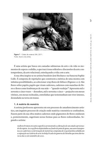 É uma artista que busca em camadas submersas da arte e da vida os momentos de espera e solidão, o que traz á tona reflexões e discussões da arte contemporânea, da arte relacional, entrelaçando a vida com a arte. A sua obra inspira-se no artista brasileiro José Bechara e na francesa Sophie Calle. É composta de repetições que constroem a métrica de uma mostra com infinitas possibilidades, ao colecionar 1095 flores de hibisco (Figuras 1 e 2). São flores sobre papéis; papéis que viram cadernos, cadernos com manchas de flores e flores como lembranças de sua mãe — “quando verdejar”! Apresenta mil e noventa e cinco vezes — desenhos, mil e noventa e cinco — projeções em mesas vitrines, em mesas recheadas, entrelinhas que testemunham um viver intenso, desnudada na terra em transe. 1. A matéria da memória