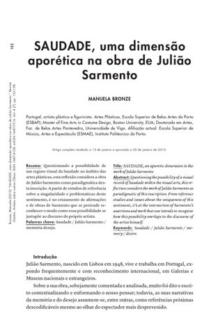 work of Julião Sarmento Abstract: Questioning the possibility of a visual record of Saudade within the visual arts, this reflection considers the work of Julião Sarmento as paradigmatic of this inscription. From reference studies and issues about the uniqueness of this sentiment, it’s at the intersection of Sarmento’s assertions and work that one intends to recognize how this possibility overlaps to the discourse of the artist himself. Keywords: Saudade / Julião Sarmento / memory / desire.