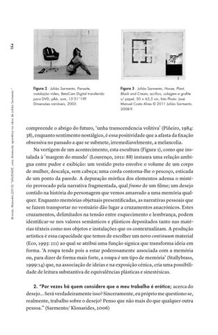 compreende o abrigo do futuro, ‘unha transcendencia volitiva’ (Piñeiro, 1984: 38), enquanto sentimento nostálgico, é essa positividade que a afasta da fixação obsessiva no passado a que se submete, irremediavelmente, a melancolia. Na vertigem de um acontecimento, esta escultura (Figura 1), como que instalada à ‘margem do mundo’ (Lourenço, 2011: 88) instaura uma relação ambígua entre pudor e exibição: um vestido preto envolve o volume de um corpo de mulher, descalça, sem cabeça; uma corda contorna-lhe o pescoço, esticada de um ponto da parede. A depuração mórfica dos elementos adensa o mistério provocado pela narrativa fragmentada, qual frame de um filme; um desejo contido na história do personagem que vemos amarrado a uma memória qualquer. Enquanto memórias objetuais presentificadas, as narrativas pessoais que se fazem transportar no vestuário dão lugar a cruzamentos anacrónicos. Estes cruzamentos, delimitados na tensão entre esquecimento e lembrança, podem identificar-se nos valores semânticos e plásticos depositados tanto nas matérias têxteis como nos objetos e instalações que os contextualizam. A produção artística é essa capacidade que temos de escolher um novo continuum material (Eco, 1993: 211) ao qual se atribui uma função sígnica que transforma ideia em forma. ‘A roupa tende pois a estar poderosamente associada com a memória ou, para dizer de forma mais forte, a roupa é um tipo de memória’ (Stallybrass, 1999:14) que, na associação de ideias e na exposição cénica, cria uma possibilidade de leitura substantiva de equivalências plásticas e sinestésicas. 2. “Por vezes há quem considere que o meu trabalho é erótico; acerca do desejo... Será verdadeiramente isso? Sinceramente, eu próprio me questiono se, realmente, trabalho sobre o desejo? Penso que não mais do que qualquer outra pessoa.” (Sarmento/ Klonarides, 2006)