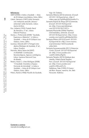 158 Bronze, Manuela (2013) “SAUDADE, uma dimensão aporética na obra de Julião Sarmento.” Revista :Estúdio, Artistas sobre outras Obras. ISSN 1647-6158, e-ISSN 1647-7316. Vol. 4 (7): pp. 152-158.
