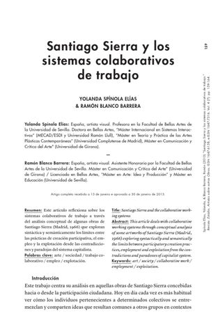 ing systems Abstract: This article deals with collaborative working systems through conceptual analysis of some artworks of Santiago Sierra (Madrid, 1966) exploring syntactically and semantically the limits between participatory creation practices, employment and exploitation from the contradictions and paradoxes of capitalist system. Keywords: art / society / collaborative work / employment / exploitation.