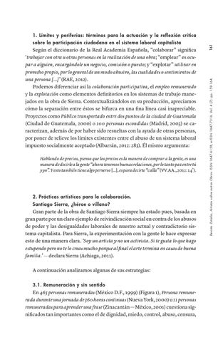 Según el diccionario de la Real Academia Española, “colaborar” significa ‘trabajar con otra u otras personas en la realización de una obra; “emplear” es ocupar a alguien, encargándole un negocio, comisión o puesto; y “explotar” utilizar en provecho propio, por lo general de un modo abusivo, las cualidades o sentimientos de una persona […]’ (RAE, 2012). Podemos diferenciar así la colaboración participativa, el empleo remunerado y la explotación como elementos definitorios en los sistemas de trabajo manejados en la obra de Sierra. Contextualizándolos en su producción, apreciamos cómo la separación entre éstos se bifurca en una fina línea casi inapreciable. Proyectos como Público transportado entre dos puntos de la ciudad de Guatemala (Ciudad de Guatemala, 2000) o 100 personas escondidas (Madrid, 2003) se caracterizan, además de por haber sido resueltas con la ayuda de otras personas, por poner de relieve los límites existentes entre el abuso de un sistema laboral impuesto socialmente aceptado (Albarrán, 2012: 283). Él mismo argumenta: Hablando de precios, pienso que los precios es la manera de comprar a la gente, es una manera de decirle a la gente “ahora tenemos buenas relaciones, por lo tanto paz entre tú y yo”. Y esto también tiene algo perverso […], es para decirte “calla” (VV.AA., 2012: 14’).