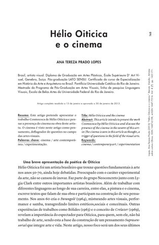 Lopes, Ana Tereza Prado (2013) “Hélio Oiticica e o cinema.” Revista :Estúdio, Artistas sobre outras Obras. ISSN 1647-6158, e-ISSN 1647-7316. Vol. 4 (7): pp. 165-171.