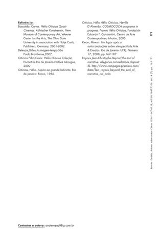 Oiticica, Hélio Hélio Oiticica, Neville D´Almeida. COSMOCOCA programa in progress. Projeto Hélio Oiticica, Fundación Eduardo F. Constantini, Centro de Arte Contemporânea Inhotim, 2005 Kwon, Miwon. Um lugar após o outro:anotações sobre site-specificity.Arte & Ensaios. Rio de Janeiro: UFRJ. Número 17, 2008, pp.167-187 Royoux,Jean-Christophe.Beyond the end of narrative: allegories,constellations,disposit ifs. http://www.campagne-premiere.com/ data/Text_royoux_beyond_the_end_of_ narrative_cat_mdm