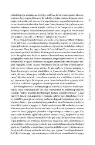 virtual disposta mimetiza a ação sobre um bloco de barro em rotação, tal como um torno de cerâmica. O sistema do trabalho consiste em uma área com iluminação controlada, onde duas webcams posicionadas perpendicularmente capturam o movimento das mãos. O software Vimus, desenvolvido por Jacome, que é também músico e possui formação em Ciências da Computação, processa a informação captada pelas câmeras juntamente com a imagem do bloco virtual composto de voxels (volumetric pixels), um tipo de pixel tridimensional. Os voxels apagam-se quando são “tocados” pela mão do visitante. Nesta obra, Jacome referencia o artesão do sertão brasileiro Mestre Vitalino (1909-1963), um ceramista que traduziu o imaginário popular e o cotidiano do nordeste brasileiro em expressivas cerâmicas figurativas, modeladas à mão por ele e por seus filhos. Em 1947, o fotógrafo francês Pierre Verger documentou o processo de produção de Mestre Vitalino, praticamente todo artesanal, desde a coleta da argila à beira do rio até a queima da cerâmica em um forno construído pelo próprio artesão. Em diversos momentos, Verger registra as mãos do artista manipulando a argila e modelando as figuras, enfatizando sua habilidade manual. O próprio Mestre Vitalino considerava que em sua terra era mais importante que se aprendesse a usar as mãos do que a cabeça. E Jacome apropria-se desse discurso para invocar a tactilidade na fruição da obra Vitalino: “use as mãos, não use a cabeça, para modelar no barro de voxels, onde o tato físico não existe”. O artista estabelece uma linha sensível entre a habilidade manual e o processamento digital da máquina, que se nutre do distanciamento entre a fisicalidade e tactilidade — propõe-se um tato que não é puramente físico. Desde surgimento das interfaces digitais controladas por mouse nossa experiência com o computador tem sido cada vez mais tátil. As interfaces permitem o diálogo “entre o universo da informação digital e o mundo ordinário” (Lévy, 1999: 37). Em especial, as interfaces táteis são cada vez mais difundidas, presentes em tablets, smartphones e outros modernos dispositivos touch com telas sensíveis aos dedos — que arrastam objetos, mancham superfícies como se estivem embebidos em tinta, apagam ou desfazem elementos. Há ainda sistemas que abarcam outros domínios de contato com o corpo do usuário, como no caso dos tapetes de dança (o jogador pisa sobre o dispositivo para controlar o jogo). Em um exemplo bastante significativo, temos a instalação 9/4 Fragmentos de azul (1997) do artista brasileiro Gilbertto Prado que utiliza monitores sensíveis ao toque. Na instalação, o visitante é imerso em imagens de céus a serem tocados e manipulados pelos dedos do visitante, que são refletidas no piso espelhado do ambiente. O trabalho se sustenta em uma relação tátil impossível: tocar nuvens. Derrick de Kerckhove ao abordar interfaces que operam “metáforas dos sentidos” (Kerckhove, 1993: 59) nos atenta para o fato de que nossas fáceis distinções