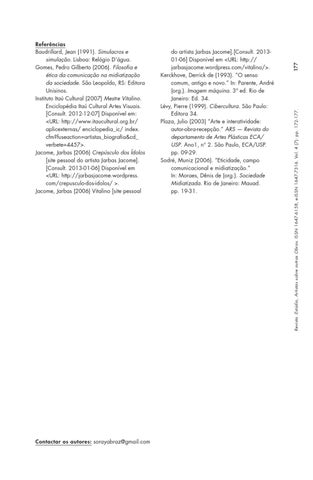 do artista Jarbas Jacome].[Consult. 201301-06] Disponível em <URL: http:// jarbasjacome.wordpress.com/vitalino/>. Kerckhove, Derrick de (1993). “O senso comum, antigo e novo.” In: Parente, André (org.). Imagem máquina. 3ª ed. Rio de Janeiro: Ed. 34. Lévy, Pierre (1999). Cibercultura. São Paulo: Editora 34. Plaza, Julio (2003) “Arte e interatividade: autor-obra-recepção.” ARS — Revista do departamento de Artes Plásticas ECA/ USP. Ano1, n° 2. São Paulo, ECA/USP. pp. 09-29. Sodré, Muniz (2006). “Eticidade, campo comunicacional e midiatização.” In: Moraes, Dênis de (org.). Sociedade Midiatizada. Rio de Janeiro: Mauad. pp. 19-31.