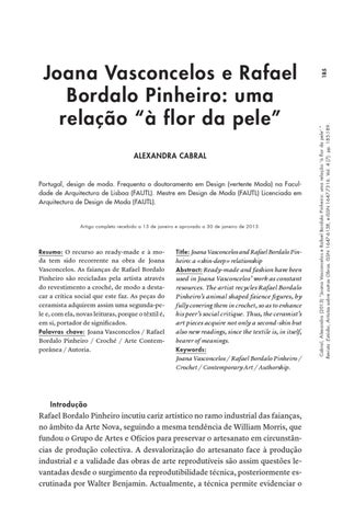 185 Cabral, Alexandra (2013) “Joana Vasconcelos e Rafael Bordalo Pinheiro: uma relação 'à flor da pele'.” Revista :Estúdio, Artistas sobre outras Obras. ISSN 1647-6158, e-ISSN 1647-7316. Vol. 4 (7): pp. 185-189.
