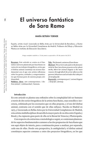 tástico universo planteado por Sara Ramo en varios de sus trabajos fotográficos, en los que el disfraz animal constituye un recurso fundamental con el que esta artista reflexiona sobre los gestos, actitudes y comportamientos que forman parte de nuestra propia cotidianeidad. Palabras clave: arte contemporáneo / disfraz animal / cotidianeidad / fantasía.