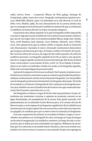 1987), Ateliers: Roma — Compostela (Museo do Pobo galego, Santiago de Compostela, 1989), Cuatro direcciones. Fotografía contemporánea española 19701990 (MNCARS, Madrid, 1991) o la individual en la Sala Minerva (Circulo de Bellas Artes, Madrid, 1989). En este afianzamiento de su carrera artística hay que ver un progreso de la misma pero también un síntoma de que se comienzan a estabilizar un sistema del arte en el que ésta puede integrarse. Caracterizar una cultura española en la que la fotografía estaba empezando a encajar es algo que excede el ámbito de esta conferencia pero puede señalarse que uno de sus rasgos clave es la institucionalidad (Marzo, Jorge Luís y Badía, Tere, 2006; Ramirez, Juan Antonio, 2010; Subirats, Eduardo, 2002 ;VVAA, 2012). Solo apuntaremos que la cultura visible en España desde la transición está directamente vinculada al nuevo entramado institucional democrático que la apoya y promociona pero que, al tiempo, establece los límites de lo posible: será una cultura del consenso, de negación del conflicto pasado y de todos los conflictos presentes. La fotografía española de los 80 se unirá a esta aparente placidez y acogerá aquella versión de la posmodernidad que Hal Foster definirá como conservadora o reaccionaria (Foster, 2006: 12). Si en España el posmoderno es un estilo (o un individuo vestido a la moda), en la fotografía española, Ouka Lele será el paradigma de posmodernidad. A pesar de la supuesta efervescencia cultural, Vari Caramés comienza su actividad en un contexto y momento en que no existía la oportunidad de profesionalizarse artísticamente (mucho menos haciendo fotografía). Las vías posibles eran la fotografía profesional instrumental o la fotografía aficionada. Viviendo de su trabajo en el Patacón, la fotografía de Vari comienza en la fotografía amateur pero también con una reivindicación del amateurismo que mantendrá hasta hoy (Vari Caramés, entrevista 2011-12-27). Sus fotografías en blanco y negro de los 80 están muy próximas a lo que entendemos por instantánea: recortan y capturan un momento concreto en un lugar determinado, sin manipulación de la escena. Esto puede acercarle a los planteamientos de su admirado Cartier-Bresson pero, si el instante decisivo de Bresson aspira a ser la captura de un fragmento significativo de la realidad en un momento preciso, lo que captura Vari son sensaciones, notas sobre una experiencia apegada a lo cotidiano pero que se mueve entre lo sensorial y lo imaginario. Con más componente de misterio en su trabajo en blanco y negro y con resultados más plásticos en su fotografía de color, este juego en el que la imagen oscila entre la imaginación y la realidad se mantiene a lo largo de toda a su trayectoria, que se define por una continuidad casi orgánica. Hablamos de un trabajo que no evoluciona en un sentido lineal o histórico, sino en un sentido acumulativo: los nuevos temas y recursos se van sumando sin que esto suponga un