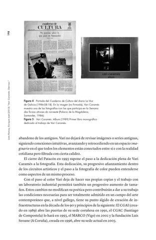 Figura 4 ∙ Portada del Cuaderno de Cultura del diario La Voz de Galicia (1986-08-18). En la imagen (no firmada), Vari Caramés muestra una de las fotografías con las que participa en la Semana das forzas atroces do noroeste (Palacio de la Magdalena, Santander, 1986). Figura 5 ∙ Vari Caramés: Album (1989) Primer libro monográfico dedicado al trabajo de Vari Caramés.