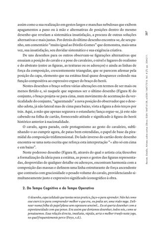 assim como a sua realização em gestos largos e manchas nebulosas que exibem apagamentos a pano ou à mão e alternativas de posições dentro do mesmo desenho que revelam a sistemática insatisfação, a procura de outras soluções alternativas e mais justas. Por detrás do último desenho encontra-se, de seu punho, um comentário “muito igual ao Dórdio Gomes” que demonstra, mais uma vez, sua insatisfação, seu duvidar sistemático e sua exigência criativa. De uns desenhos para os outros observam-se figurações alternativas que ensaiam a posição do cavalo e a pose do cavaleiro, o nível e lugares do realismo e do abstrato (entre as figuras, as texturas ou os adereços) e ainda as linhas de força da composição, crescentemente triangular, que se parecem afirmar pela posição da capa, elemento que na estátua final quase desaparece cedendo sua função compositiva ao expressivo erguer do braço do herói. Nestes desenhos o braço sofreu várias alterações em termos de ser mais ou menos fletido e, só naquele que supomos ser o último desenho (Figura 8) do conjunto, o braço projeta-se para cima, num movimento de acentuação da verticalidade do conjunto, “aguentando” a nova posição do observador que o desenho adota, já não lateral mas de cima para baixo, vista a figura a dois terços por trás. Aqui, a mão que apenas segurava o estandarte/lança ergue-se, já este não cabendo na folha de cartão, fornecendo atitude e significado à figura do herói histórico anterior à nacionalidade. O cavalo, agora parado, cede protagonismo ao gesto do cavaleiro, sublinhando-o ao cumprir agora, de patas bem estendidas, o papel de base da piramidal da composição tridimensional. Do lado inverso do cartão deste desenho encontra-se uma nota escrita que reforça esta interpretação “+ alto só em cima e em baixo”. Neste poderoso desenho (Figura 8), através do qual o artista cria/descobre a formalização da ideia para a estátua, as poses e gestos das figuras representadas, desprovidas de qualquer detalhe ou adereços, encontram harmonia com a composição das massas e definem uma linha estruturante de força ascendente que contraria com graciosidade o pesado volume do cavalo, providenciando simultaneamente justo e expressivo significado iconográfico à obra.