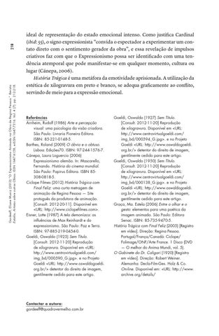 Goeldi, Oswaldo (1927) Sem Título. [Consult. 2012‑11‑20] Reprodução de xilogravura. Disponível em <URL: http://www.centrovirtualgoeldi.com/ img_bd/000594_G.jpg>. e no Projeto Goeldi <URL: http://www.oswaldogoeldi. org.br/> detentor do direito de imagem, gentilmente cedido para este artigo. Goeldi, Oswaldo (1950) Sem Título. [Consult. 2012‑11‑20] Reprodução de xilogravura. Disponível em <URL: http://www.centrovirtualgoeldi.com/ img_bd/000138_G.jpg>. e no Projeto Goeldi <URL: http://www.oswaldogoeldi. org.br/> detentor do direito de imagem, gentilmente cedido para este artigo. Graça, Ma. Estela (2006) Entre o olhar e o gesto: elementos para uma poética da imagem animada. São Paulo: Editora Senac. ISBN: 85-735-9470-5. História Trágica com Final Feliz (2005) [Registro em vídeo]. Direção: Regina Pessoa. Portugal/França/Canadá: Ciclope/ Folimage/ONF/Arte France. 1 Disco (DVD — O melhor do Anima Mundi, vol. 5). O Gabinete do Dr. Caligari (1920) [Registro em vídeo]. Direção: Robert Weiner. Alemanha: Decla-Film-Ges. Holz & Co. On-line. Disponível em: <URL: http://www. archive.org/details/