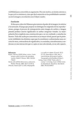 Referencias Bryson, Norman (2005) Volver a mirar. Cuatro ensayos sobre la pintura de naturalezas muertas. Madrid: Alianza. ISBN: 84-2067964-X Dewey, John (2002) Democracia y educación. Madrid: Morata. ISBN: 84-7112-391-6 Nilausen, Rasmus (2011) Sísifo, Rhopografía