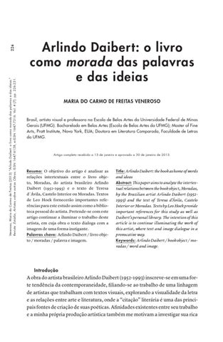 226 Veneroso, Maria do Carmo de Freitas (2013) “Arlindo Daibert: o livro como morada das palavras e das ideias.” Revista :Estúdio, Artistas sobre outras Obras. ISSN 1647-6158, e-ISSN 1647-7316. Vol. 4 (7): pp. 226-231.
