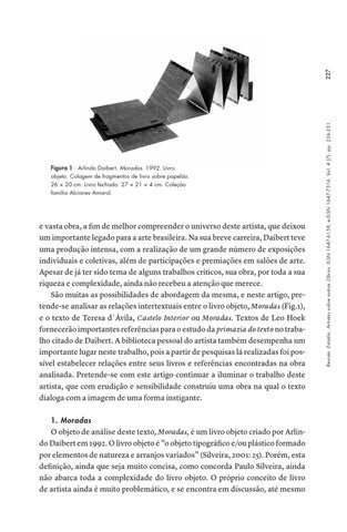 e vasta obra, a fim de melhor compreender o universo deste artista, que deixou um importante legado para a arte brasileira. Na sua breve carreira, Daibert teve uma produção intensa, com a realização de um grande número de exposições individuais e coletivas, além de participações e premiações em salões de arte. Apesar de já ter sido tema de alguns trabalhos críticos, sua obra, por toda a sua riqueza e complexidade, ainda não recebeu a atenção que merece. São muitas as possibilidades de abordagem da mesma, e neste artigo, pretende-se analisar as relações intertextuais entre o livro objeto, Moradas (Fig.1), e o texto de Teresa d´Ávila, Castelo Interior ou Moradas. Textos de Leo Hoek fornecerão importantes referências para o estudo da primazia do texto no trabalho citado de Daibert. A biblioteca pessoal do artista também desempenha um importante lugar neste trabalho, pois a partir de pesquisas lá realizadas foi possível estabelecer relações entre seus livros e referências encontradas na obra analisada. Pretende-se com este artigo continuar a iluminar o trabalho deste artista, que com erudição e sensibilidade construiu uma obra na qual o texto dialoga com a imagem de uma forma instigante. 1. Moradas