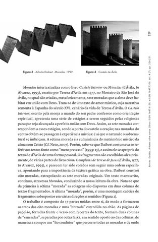 Moradas intertextualiza com o livro Castelo Interior ou Moradas (d’Ávila, In Alvarez, 1995), escrito por Teresa d’Ávila em 1577, no Mosteiro de São José de Ávila, no qual são criadas, metaforicamente, sete moradas que a alma deve habitar em união com Deus. Trata-se de um texto de amor místico, cuja narrativa remonta à Espanha do século XVI, cenário da vida de Teresa d’Ávila. O Castelo Interior, escrito pela monja a mando do seu padre confessor como orientação espiritual, apresenta uma série de estágios a serem seguidos pelas religiosas para que seja alcançada a perfeita união com Deus. Assim, as sete moradas correspondem a esses estágios, sendo a porta do castelo a oração; nas moradas do centro obtém-se passagem à experiência mística: é aí que o natural e o sobrenatural se imbricam. A sétima morada é a culminância do matrimônio místico da alma com Cristo (Cf. Neto, 2007). Porém, sabe-se que Daibert costumava se referir aos textos fonte como “mero pretexto” (1995: 15), e assim ele se apropria do texto de d’Ávila de uma forma pessoal. Os fragmentos são escolhidos aleatoriamente, de várias partes do livro Obras Completas de Teresa de Jesus (d’Ávila, 1577, In Alvarez, 1995), e parecem ter sido colados sem seguir uma ordem específica, apontando para a importância da textura gráfica na obra. Daibert constrói oito moradas, extrapolando as sete moradas originais. Um texto manuscrito, contínuo, atravessa Moradas, conduzindo a nossa leitura da obra. Nota-se que da primeira à sétima “morada” as colagens são dispostas em duas colunas de textos fragmentados. A última “morada”, porém, é uma montagem caótica de fragmentos sobrepostos em várias direções e sentidos (Figura 2). O trabalho é composto de 17 partes unidas entre si, de modo a formarem os tetos das oito moradas e uma “entrada” estendida no chão. As páginas de papelão, forradas frente e verso com recortes do texto, formam duas colunas de “emendas”, separadas por outra faixa, em sentido oposto ao das colunas, de maneira a compor um “fio condutor” que percorre todas as moradas e de onde