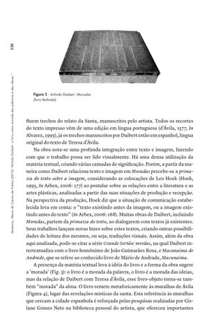 fluem trechos do relato da Santa, manuscritos pelo artista. Todos os recortes do texto impresso vêm de uma edição em língua portuguesa (d’Ávila, 1577, In Alvarez, 1995), já os trechos manuscritos por Daibert estão em espanhol, língua original do texto de Teresa d’Ávila. Na obra nota-se uma profunda integração entre texto e imagem, fazendo com que o trabalho possa ser lido visualmente. Há uma densa utilização da matéria textual, criando várias camadas de significação. Porém, a partir da maneira como Daibert relaciona texto e imagem em Moradas percebe-se a primazia do texto sobre a imagem, considerando as colocações de Leo Hoek (Hoek, 1995, In Arbex, 2006: 177) ao postular sobre as relações entre a literatura e as artes plásticas, analisadas a partir das suas situações de produção e recepção. Na perspectiva da produção, Hoek diz que a situação de comunicação estabelecida leva em conta: o “texto existindo antes da imagem, ou a imagem existindo antes do texto” (In Arbex, 2006: 168). Muitas obras de Daibert, incluindo Moradas, partem da primazia do texto, ao dialogarem com textos já existentes. Seus trabalhos lançam novas luzes sobre estes textos, criando outras possibilidades de leitura dos mesmos, ou seja, traduções visuais. Assim, além da obra aqui analisada, pode-se citar a série Grande Sertão: veredas, na qual Daibert intertextualiza com o livro homônimo de João Guimarães Rosa, e Macunaíma de Andrade, que se refere ao conhecido livro de Mário de Andrade, Macunaíma. A presença da matéria textual leva à idéia do livro e a forma da obra sugere a ‘morada’ (Fig. 3): o livro é a morada da palavra, o livro é a morada das ideias, mas da relação de Daibert com Teresa d’Ávila, esse livro-objeto torna-se também “morada” da alma. O livro remete metaforicamente às muralhas de Ávila (Figura 4), lugar das revelações místicas da santa. Esta referência às muralhas que cercam a cidade espanhola é reforçada pelas pesquisas realizadas por Gislane Gomes Neto na biblioteca pessoal do artista, que ofereceu importantes