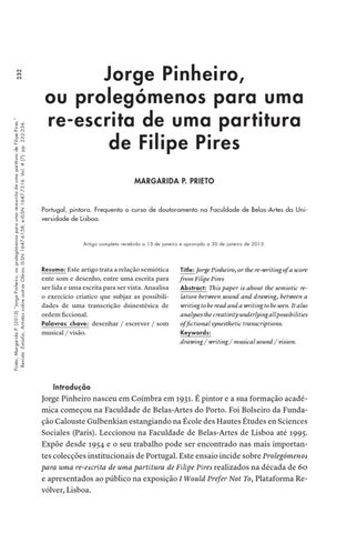 232 Prieto, Margarida P. (2013) “Jorge Pinheiro, ou prolegómenos para uma re-escrita de uma partitura de Filipe Pires.” Revista :Estúdio, Artistas sobre outras Obras. ISSN 1647-6158, e-ISSN 1647-7316. Vol. 4 (7): pp. 232-236.
