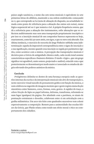 países anglo-saxónicos, o nome das sete notas musicais é equivalente às sete primeiras letras do alfabeto, mantendo a sua ordem estabelecida: começando no A, que corresponde ao Lá (nota de afinação do diapasão, na actualidade tomada como ponto de referência para a afinação das outras seis notas), numa lógica sequencial até ao G que nomeia o Sol. A própria frequência sonora, que dá a referência para a afinação dos instrumentos, sofre alterações que se reflectem auditivamente mas sem uma transposição propriamente inscriptiva e por isso se a inscrição musical de um compositor barroco representa-se hoje, exactamente, como há 250 anos atrás, em rigor, o que se ouve está alterado. Em última instância, o exercício de reescrita de Jorge Pinheiro sublinha uma indeterminação: aquela da impossivel correspondência entre o signo de inscrição e a sua significação, mesmo quando essa inscrição se regula por parâmetros rígidos, como acontece com a música. A percepção das transposições musicais é decisiva para a Grécia da antiguidade clássica onde, cada escala tonal assume características específicas e humores distintos. O modo «Lígio», que em grego significa voz agradável, canto sonoro, projectado e audível, coíncide com o que posteriormente se denominará por modo maior e é associado os estados de alegria relevando dos poderes anímicos da música. Conclusão