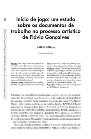 ments in the artistic process of Flavio Goncalves Abstract: This article aims to demonstrate the importance of working documents in the creative process of the artist Brazilian Flávio Gonçalves. Goncalves carries for drawing images of childhood that allegorize the myth of the origin and creation. But, at the same time, these images would not be expressing the utopian eye? Keywords: working documents / drawing / images of childhood / utopian eye.